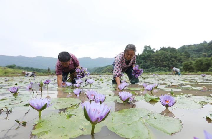 2022年6月28日,在貴州省赤水市寶源鄉(xiāng)玉豐村,村民在采摘香水蓮花。近年來(lái),貴州省赤水市寶源鄉(xiāng)采取“黨支部+合作社+農(nóng)戶”模式,引導(dǎo)農(nóng)民種植集觀賞、藥用、食用為一體的香水蓮花,帶動(dòng)農(nóng)民增收,助力鄉(xiāng)村振興。新華社發(fā)(王長(zhǎng)育 攝)