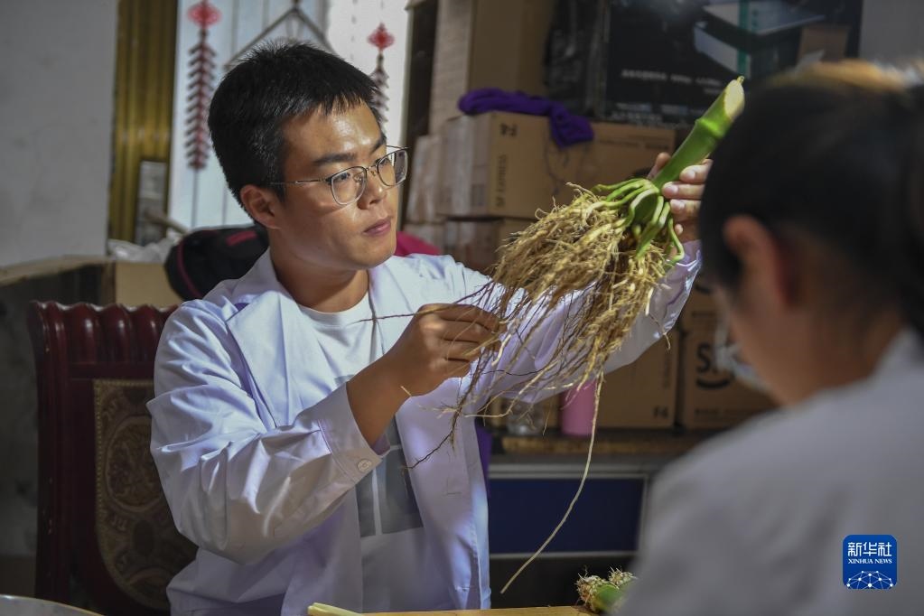 2021年8月2日,在吉林省梨樹縣四棵樹鄉(xiāng)三棵樹村“科技小院”,中國農(nóng)業(yè)大學學生沙野查看玉米根系樣本。新華社記者 張楠 攝