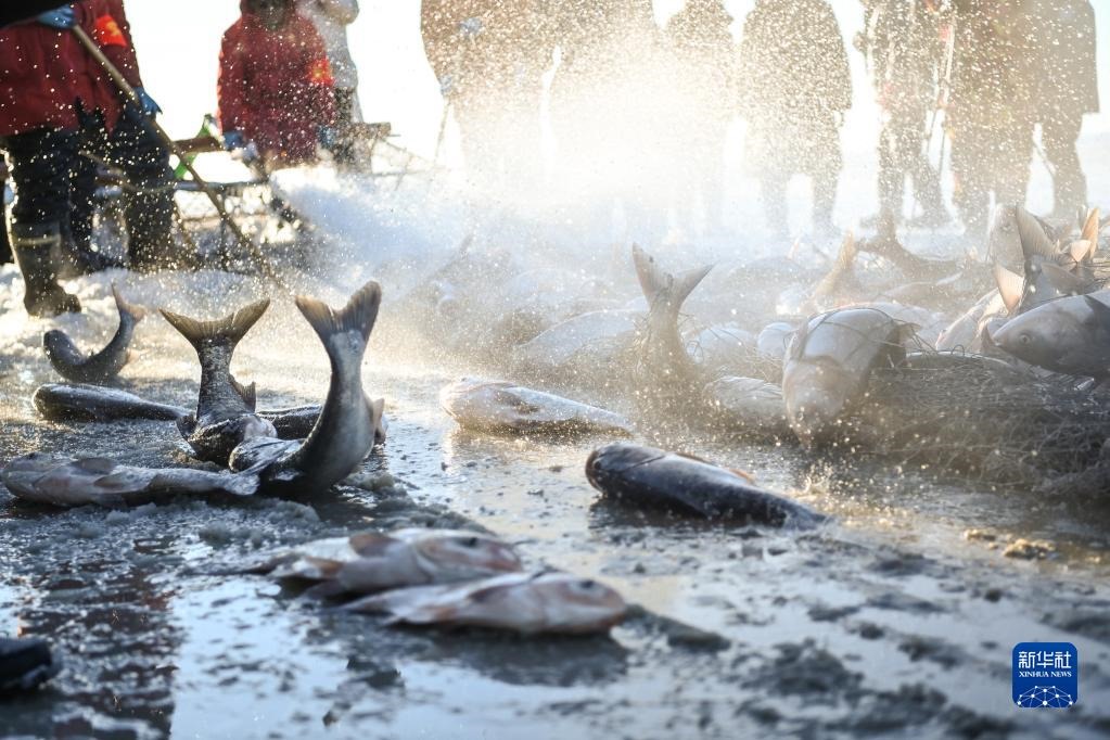漁民在查干湖里捕魚(2021年12月26日攝)。新華社記者 顏麟蘊 攝